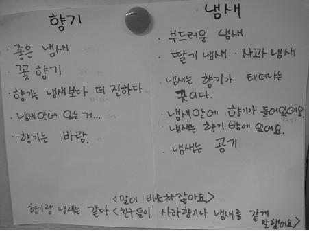 - 아이들과 식물의 향기에 관한 활동들을 하면서 향기와 냄새라는 말을 번갈아가며 교사와 유아가 별 구분없이 사용하였다. 그러다 유치원 마당에서 향기를 찾다 장미꽃에서 나는 것은 향기이고 비석에서 나는 안 좋은 것은 냄새라는 이야기를 통해 향기와 냄새에 대한 유아들의 생각들을 들어보았다.