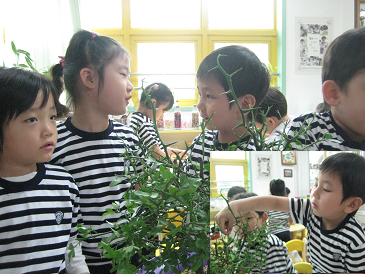 유아1: 오늘도 애벌레 똥 초록색이네~교사: 그런데 우리들 똥은 나무 색깔도 있고 검은 색깔도 있는데 왜 애벌레는 어제도, 오늘도 초록색 똥만 쌌지?? 유아3: 그거는 우리가 먹는 음식 색깔은 여러가지인데 지금 애벌레가 먹는 음식은 초록색깔 뿐이자나요. 그래서 초록색 똥만 지금 누고 있는 거예요! 유아4: 맞다. 나중에 다른 음식 주면 우리들 처럼 똑같은 똥 쌀껄!!