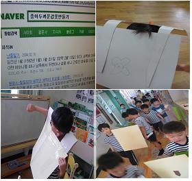 다음날 어떤 일이 나타났을까요? 아침부터 컴퓨터에 와서 <갑옷>을 검색해보고 갑옷 디자인을 시작합니다. 유아8: 어제 여자친구가 만든 갑옷은 테이프로 붙여서 입고 벗기가 힘들어. 유아2: 맞다. 갑옷은 옷이라서 입을 수 있어야하는데!