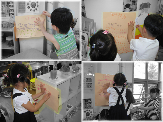 교실에서 일어나는 여러 가지 일들에 대한 해결방법을 찾기 위해 아이들은 규칙에 대해 이야기를 나누었다.규칙을 정하면 아이들 사이에서 빈번히 발생하는 여러 가지 일들에 대한 해결을 할 수 있을 것이라 생각한 듯 하였다. 그렇게 아이들은 함께 교실 안에서 지켜야 할 규칙들에 대해 알아보며 이야기 나누었다. 직접 규칙을 정하고 또 아이들이 직접 규칙을 적어보고, 붙일 곳을 정해 자신들의 손으로 교실 곳곳에 붙여보는 시간을 가졌다.