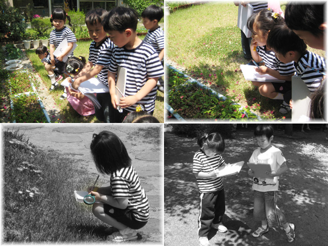 ⊙야외 스케치 두 번째 이야기⊙싱그러운 햇살 가득한 날 새싹반 아이들은 또 다시 야외 스케치를 나가게 되었다. 지난 시간 아이들이 그린그림을 살펴보고 이번에 나가게 되면 어떤 것을 그려볼 지 미리 생각을 해보았다. 지난 시간보다 우리 유치원에서 앞마당에서 바라본 주변의 모습과 자연 환경에 대해 조금 더 자세히 관찰해보기로 하고 나갔다. “선생님 이거(돋보기)가져가도 되요?” “이번에는 자세히 관찰하기로 했으니깐 그걸로 보면 더 잘 보이겠다. 나도 갖고 가야지.” “나도 나도~” “나도~” “야~ 양보해서 같이 쓰면 된다. 나가서 같이 봐라!”