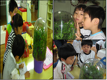 -유아들은 자라나는 애벌레를 보며 너무나 귀여워하며 관찰합니다. 꽃잎반 친구들이 자라 듯 애벌레가 자라는 것을 지켜보고 있네요.