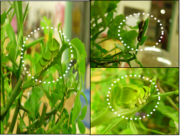 꽃잎반에 새로운 친구가 찾아왔어요. 그건 바로 애벌레랍니다. 처음에는 애벌레가 아주 작아서(몸통이 2mm정도) 눈으로 바로 찾기도 힘들었어요. 그런데 주말이 지나고 나서 커다란 갈색애벌레로 변했어요.(몸통이 6mm정도) 그리고 또 하루 밤이 지나자 애벌레가 사라져버렸어요.