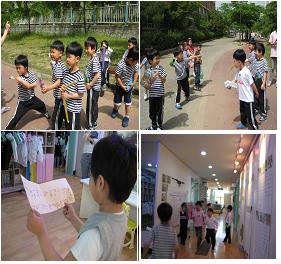 유아1: 진짜 재밌다. 집에서도 못하게 하고 교실에서도 못했는데 진짜 속이 시원해요. 유아2: 얼굴은 공격하면 안돼. 발로 차는 것도 안돼. 이건 놀이니까 규칙이 있어야 해.잠시 뜸하더니 몇일 전부터 조형영역에서 무기를 만들고 공격할 움직임이 보여요. 아니나다를까 드디어 햇살반도 우리를 향한 공격의 마음을 갖고 있었나봐요. <하늘반을 공격하라! 하늘반은 항복하라!> 종이에 써서 선전포고를 합니다. 햇살반과 하늘반 교사들은 아이들의 놀이를 <위험, 금기시 함>으로만 보지 않고, 이 경험을 통해 어떤 교육적 경험을 할 수 있을지 고민해 봅니다. 규칙을 지킬 것을 약속하고~ 놀이 시작! 유아1: 하늘반은 조선! 햇살반은 명나라! 조선의 군사야 힘을 내서 싸워라! 유아2: 하늘반은 조선해라. 햇살반은 우리나라 한다!