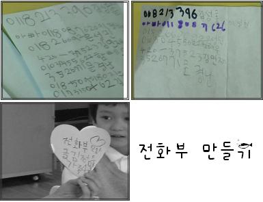 며칠 전부터 작은 색종이를 가지고 다니는 아이들의 모습이 보였다. 자세히 살펴보니 작은 종이 안에는 깨알같이 적은 숫자들이 가득했다.(OOO 아빠 전화번호010-0000000)(OOO 집 전화번호 000-000) 햇살반 친구들과 연락할 수 있는 전화번호를 많이 적어 놓았다. C1: 우리 엄마 번호다. 여기로 전화해라. 친구들의 전화번호 교환으로 아이들의 가방 속에서 전화번호가 적힌 종이를 볼 수 있었다. 공유시간을 통해 "전화번호부"를 알게 되었다. C2: 전화번호 까 먹을 때 적는거야. C3: 우와! 멋지다. 서로가 더 친해지고 연결될 수 있는 방법으로 아이들은 전화번호를 찾은 것 같다. 가정에서 아이들과 전화예절에 대해 이야기 나눠보세요. 그리고 햇살반 친구들에게 전화가 온다면 상냥하게 받아주세요.< 즐거운 소풍 >
