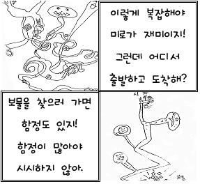 자유선택활동시간에 친구들이 그린 미로는 공유시간을 통해 확대 됩니다. 교사: 너희들이 보았던 미로와 어떤 점이 다른 것 같아? 길이 복잡해서 찾기 힘들게 만들어야 해요. 막혀있으면 다른 길로 돌아가기도 하는데 저건 너무 쉽게 되어 있어요. 함정이 있어야 해요. 도착점이랑 시작하는 점이 멀리 떨어져 있어야 해요. 유아들은 각자 경험한 미로의 개념을 그림을 통해 표상해 봅니다. 유아들 마다 미로의 모습은 다릅니다. 선 형태의 미로, 길 형태의 미로, 게임판 형태의 미로 등 각자 자신이 경험한 것에 따라 미로의 모습은 다양하게 표현됩니다. 미로를 만든 유아들은 자신의 미로를 직접 풀어보기도 하고 친구와 선생님에게 풀어 보게 하며 점점 더 어려운 미로를 만들기 위해 노력합니다.그 후 유아들에게 지난시간에 그림으로 표현했던 5가지의 미로를 복사하여 제공합니다. 그리고 또 다시 공유가 시작됩니다.<첫번째 미로>적혀있는 말이 무슨 말인지 몰라서 힘들었어요. <두번째 미로> 도착이 없어요. <세번째 미로> 도착이 적혀 있지는 않았지만 도착점일거라 생각하고 풀었어요. <네번째 미로>어느 부분이 함정인지 몰랐어요. 그림은 있는데 설명이 없어요.<다섯번째 미로> 너무 쉬워서 더 어렵게 만들었으면 좋겠어요. 내가 만든 미로를 친구에게 풀어보게 하려면 출발지점과 도착지점이 분명해야 한다는 것, 그림이 있으면 설명도 있어야 한다는 것을 알게된 시간이었답니다. 내가 만든 미로뿐만 아니라 다른 친구들이 만든 미로를 풀어봄으로써 미로에 대한 개념 구성과 경험을 확장시켜 나가게 되었습니다. 유아들의 미로는 어떤 형태로 발전해 나갈까요?