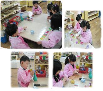 햇살반의 아침 영역시간...아이들이 이것 저것 놀이를 하느라 바빴다. 그런데 아이들이 도예영역으로 모이더니 평소에는 하지 않았던 고무찰흙 놀이를 하는 모습이 보였다. C1: 선생님 이거 해도 돼요?