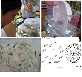 -하늘반 친구가 들고 온 올챙이에 많은 흥미를 느낍니다. 많은 올챙이들이 생활하기에 콜라병은 너무 좁습니다. 곧 알도 부화할 것 같아서 큰 집으로 옮겨주기를 계획합니다.