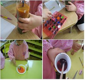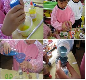 유아들은 색을 옮기는 과정에서 물감을 엎지르는 경험이 잦아지자 물감을 흘리지 않고 색을 옮길 수 있는 방법에 대해 고민합니다. 교실에는 좁은 통에 옮길 수 있는 적합한 매체를 찾는 유아들의 모습이 보입니다. 물약통, 주사기, 요플레 덮개를 발견하니다. 물약통 뚜껑을 열어 색을 옮기고 주사기로 색을 옮기는 물감 영역은 마치 과학 실험실을 연상케 합니다. 재미있는 일이 보여요. 조형영역에서 요플레 덮개를 발견하고 깔때기를 만들어 색 섞기를 시도하기도 합니다. 교사: 이런거 어디서 봤어? 유아: 참기름 집에서 이렇게 해요. 이렇게 하면 안 흘리고 넣을 수 있거든요. 순식간에 많은 색을 만들고 다양한 용기를 가져오고, 옮길 매체를 찾고 부딪치는 문제들을 해결할 방법들을 찾아가고 배우는 과정에서 물감영역은 하늘반 유아들에게 도전적인 공간으로 변화되어 갑니다.