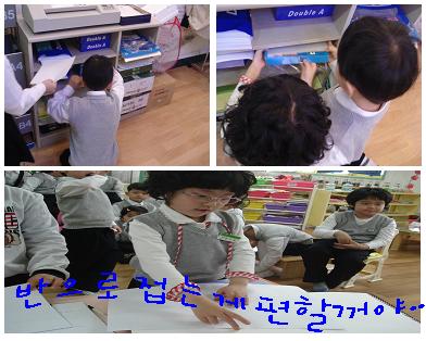 유아4: 딱지는 반듯하게 딱딱 맞게 접어야 해. 잘 못 접으면 굵어져서 다른 사람이 다 따버리거든.