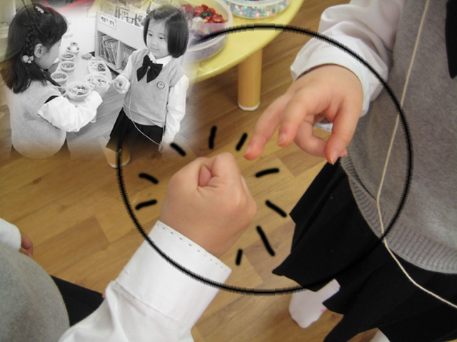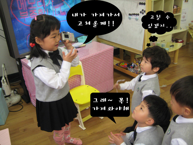 놀이시간 한 아이가 사진기를 가져와 셔터를 마구 누르며 말했다.