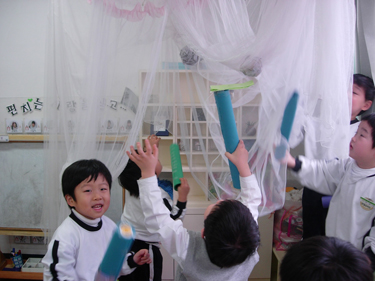 역할영역에서 유아들은 레이스에 공을 던지고 빼는 놀이를 하고 있습니다. 여러가지 방법으로 놀이를 하던 아이들은 언제부터인가 모두들 긴 막대기를 가지고 공을 꺼내기 시작합니다.
