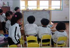 화이트보드와 대그룹 의자를 이용하여 인형극 무대를 만들어낸다.