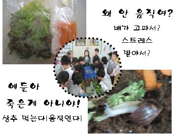 유아3: 야~달팽이 안 죽었다. 몸이 나왔다. 상추 먹을려고 한다. 으하하하