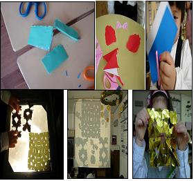 말을 마치자 달려가서 색종이로 모양을 만들어봅니다. 꼬깃꼬깃 색종이를 접어서 여기저기 가위로 모양을 내고 펼쳤더니~