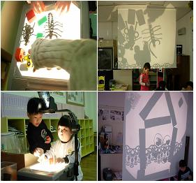 ohp 위에 블록과 옆의 매체를 올려놓고 불을 켜자 하늘반에 큰 빛 한줄기가 친구들을 매료시킵니다.