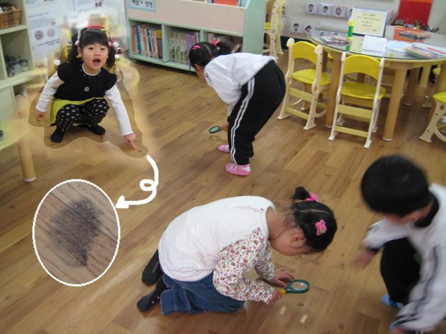 그때부터 아이들은 먹물을 밟은 범인을 찾겠다며 돋보기를 들고 이리 저리 온 바닥을 다 살펴보기 시작했다.
