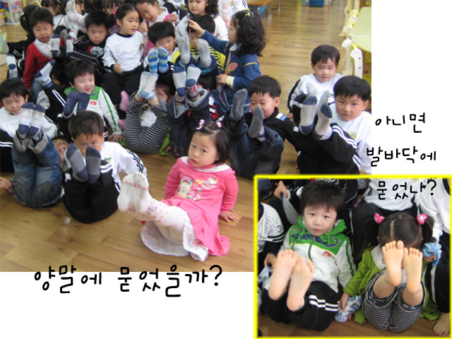 그러자 아이들은 바로 양말을 벗어 발바닥을 살펴보기 시작했고 결국 발바닥에 검정 먹물이 묻은 유아를 찾아낼 수 있었다.