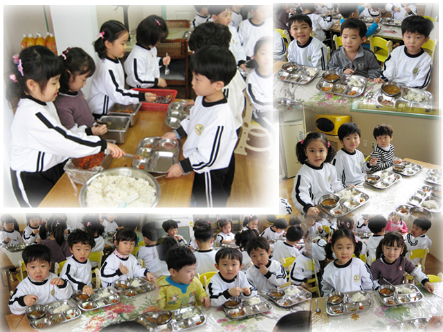 점심시간이 되었어요. 꼬마 선생님이 된 친구들이 다른 친구들에게 직접 맛있는 음식을 나누어주었어요. 식사를 받은 친구들이 자리에 멋지게 앉아 감사 인사를 한 뒤 맛있게 먹고 있답니다.