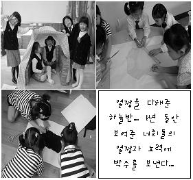늘 신이나서 활동하며 선생님까지 들뜨게 만들었던 팀이랍니다. <옷 만들기>라는 커다란 숙제를 완성해 버린 의상팀... 누구도 상상하지 못했던 옷 만들기의 많은 과정들을 차근차근 알아가며 친구들을 놀라게 했었지요. 디자인, 옷본 그리고 꾸미기까지... 의상팀이 보여준 솜씨는 정말 수준급이었답니다.