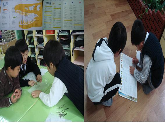 분류를 하는 유아들속에서 저마다의 다른 특성이 나타났습니다.공룡의 이름을 불러주는 유아, 공룡의 이름을 듣고 초식과 육식을 분류하는 유아,마지막으로 그림을 보면서 책을 이용해 공룡을 찾아가는 유아의 분업화된 활동으로 분류 활동은 마무리 되었습니다.