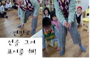 유아3: 사진이 잘 나오는 곳을 찾아서 사진을 찍을 사람과 찍어주는 사람이 설 자리에 연필로 긋는거야. 그리고 그 자리에 서서 사진을 찍으면 잘 나올거야.