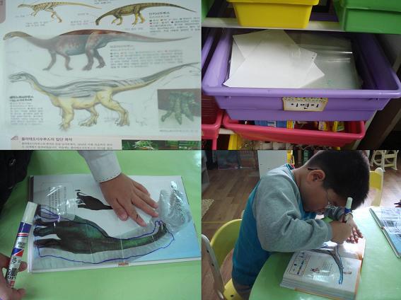 유아들은 교실에 있는 매체물을 이용해서 공룡그림을 그려보기로 합니다.