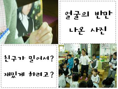 유아3: 사진을 찍으려는데 옆에 있던 친구가 미는 바람에 친구 얼굴이 다 안 나오고 반만 나온거 같은데.