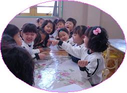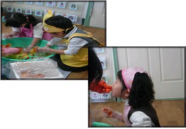 소금에 절여진 배추에 양념을 바르는 방법을 알아보고 유아들의 김장 담그기가 시작 되었다.