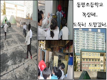 유아들: 도둑이 도망갔어요. 없어졌어요. 도둑이 딴 사람으로 변장 한 것 같아. 우리 나눠서 찾아 봐요. 저기 동평 초등학교 옥상으로 도망 간 것 같아요. 교사: 도둑 모습이 보여?