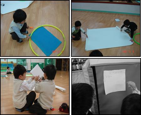 자신이 준비한 종이가 훌라후프의 크기보다 작음은 발견한 유아!