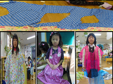 -원피스 위 길이를 재는 것은 의상영역에서 같이 활동하고 있는 친구의 도움을 빌리기로 합니다. 유아는 앞, 뒤 전부 60이라는 길이와 크기를 맞추려 합니다. 바닥에 두개의 천을 겹쳐서 편 후 가위로 오려 똑같은 모양의 두 천을 만듭니다.그리고 어깨의 길이를 재어 긴천을 맞추어 두개를 잘라 네모 자릅니다. 서로 연결하여 예쁜 옷 완성!