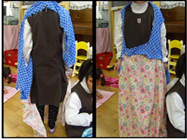 교사: 치마로 만든 천은 선생님이 의상영역에 천이 많은 곳에서 본 것 같은데 한 번 가볼래요? 아니면 천이 닿일 것 같은데 잡아서 고정시키는 방법은 어때요?