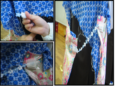 -유아에게 까슬이 보슬이 외 천을 고정시킬 수 있는 것을 몇가지 제시해 주었습니다. (예: 스카치테이프, 양면테이프, 목공풀, 스탬플러) 그 중에서 유아는 스탠플러를 선택하여 옷을 고정시키고 모양을 만들기 시작합니다. 그런데 문제점이 해결되지 않자 의상영역에서 함께 옷 만들기를 하는 친구에게 이 옷을 입어봐달라고 부탁합니다. 그제서야 문제점을 더 직시하고 손으로 어림잡아 옷을 보면서 고민에 빠집니다.