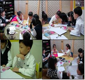 유아1: 테이프로 붙여서? 유아2: 그럼 잘 떨어지잖아 그림 그릴 때.. 여러 가지 생각 나누기 끝에 교사가 헨젤 옷 만들기 할 때 바지를 고정했던 시침핀을 상기 시켜 주었답니다. 유아1: 조심해! 바늘에 찔릴 수도 있어.유아3: 그래 천천히.. 바늘에 찔릴 것 같아. 유아4: 조심조심 끼워야해! 의상팀 모두가 하나가 되어 시침핀 고정하기에 열중합니다.
