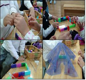 모형의 크기도 다양하고, 철사에 호스를 끼우는 유아, 철사만 사용하는 유아, 호스만 사용하는 유아 등 창의적인 문제해결 모습이 엿보입니다.