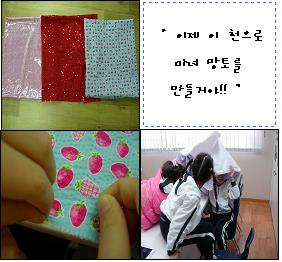 곁에 있던 친구들이 하나둘씩 의상팀으로 모여듭니다. 친구들의 도움을 받아서 조심조심 천을 잘라봅니다.