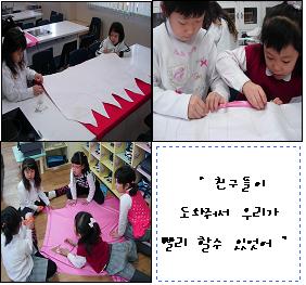 유아: 친구들이 도와줘서 빨리 할 수 있었어! 너무 기뻐~
