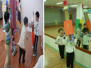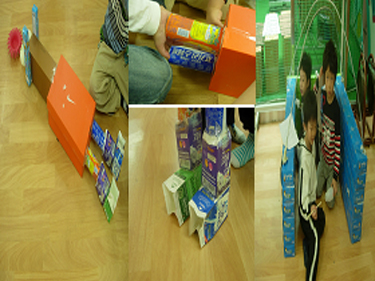 유아2: 이렇게 붙이면 되잖아.(여러 상자와 캔을 연결하여 유아들의 키만한 괴물을 만듭니다. 그리고 놀이를 하기 위해 괴물을 세워봅니다.)유아: 넘어진다.