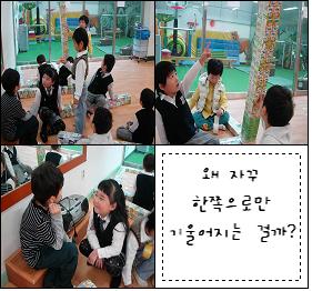 유아8: 그건요. 기둥 아래쪽만 붙여져있어서 그런 것 같아. 유아1: 맞아. 그러니까 중심이 안 맞아서 자꾸 기울잖아. 아래는 붙어있고, 위에는 안붙어 있으니까 위에 있는 기둥이 힘이 없어서 그래.