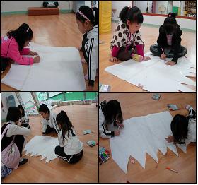 유아1: 우리가 무대막을 어떻게 만들지는 생각했거든. 그런데 그림을 우리가 그리기 힘들어. 좀 도와줘야겠어.