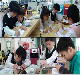 유아2: 우리는 헨젤과 그레텔 집 안, 숲속, 마녀집안 3개의 그림이 필요해. 한사람이 하기 힘드니까 나눠서 할까? 유아3: 그러지 말고 모두 그려서 투표를 하면 어때? 누가 잘 그릴지 해봐야 알지.