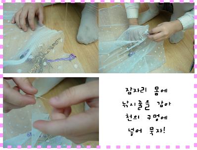 유아3: 이 천에 구멍이 많으니깐 구멍으로 넣어서 묶으면 되겠다.