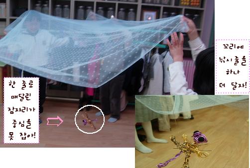 유아: 잠자리 다는 거 힘들어. 낚시줄을 묶을 줄 아는 친구들이 도와줘야해.