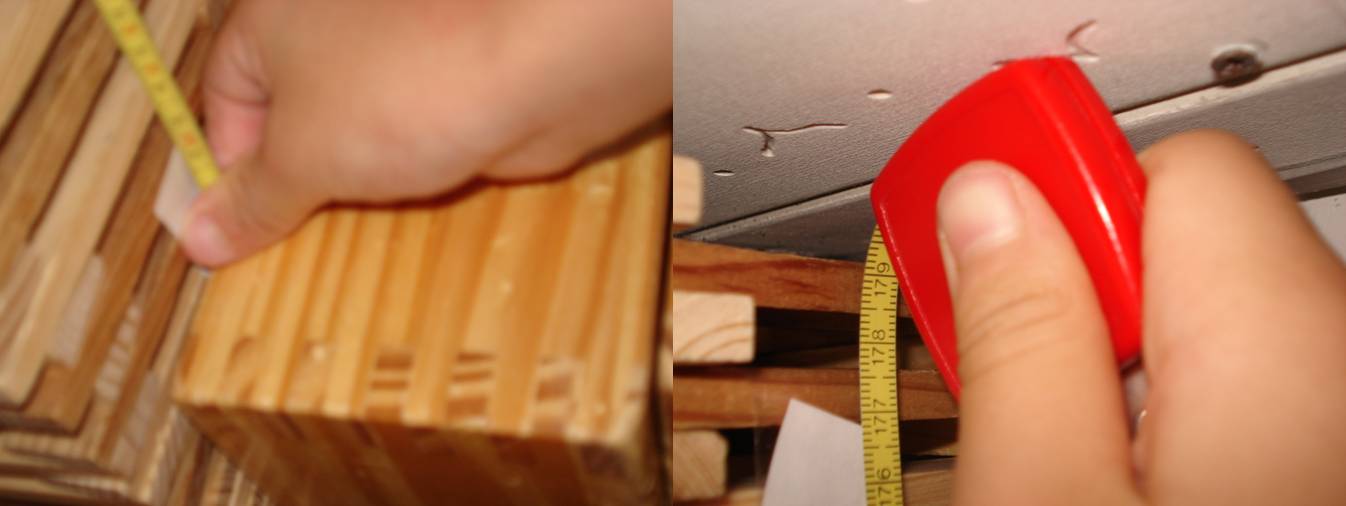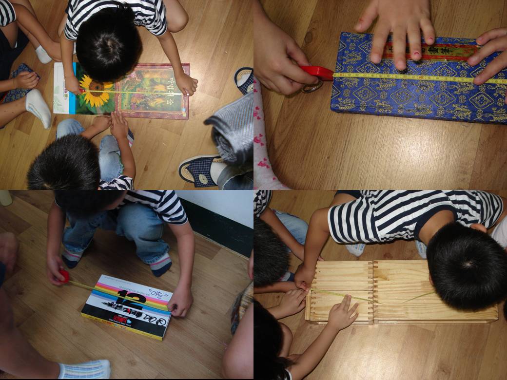 물건과 줄자를 더해서 카프라의 키(높이)를 알고하는 유아들.