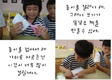유아:아빠랑 집에서 책을 만들었었는데 종이를 잘 라서 붙여서 묶으니까 책이 되었어요.