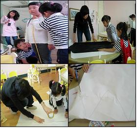 먼저 줄자를 사용하여 친구들이 입을 망토 길이 만큼 길이를 재어 와서 종이에 그 길이를 표시 합니다. 유아1: 망토 옆 넓이는 교실에 있는 망토 만큼 하면 되잖아. 유아2: 근데 종이 길이가 망토 길이 보다 짧은데.. 유아3: 그럼 종이 두장을 잘라서 붙이면 되잖아. 망토 크기만큼 만들어진 큰 종이위에 의상팀은 조사한 종이를 보며 망토를그려 나갑니다. 팀1: 우리는 뾰족뾰족 망톤데!! 이렇게 그려서 자르면 완성!! 팀2: 우리는 재아가 밑에 둥글게 만들어 달라고 해서 이렇게 그리고 있다. 팀3: 우리는 아직 덜 물어 봐서 지금 물어보고 더 자세하게 그리자!! 각 팀별로 서로 의논을 하며 하나의 옷본을 만들어 가는 의상팀~ 어떤 모습의 망토로 완성될까요?<소품팀>