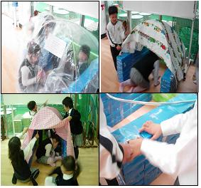 유아2: 그런데 이거 너무 촌스러운데. 뭔가 꾸며야 할 것 같지 않아? 유아6: 위에 비닐말고 다른걸로 하자. 텐트니까 천으로 씌우면 좋겠는데