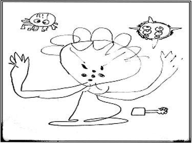유아들: 무섭게 생겼어요. 못생겼어요. 다리가 아주 많아요. 눈이 5개에요. 구름 괴물. 이빨은 뾰족해요. 팔 다리는 없어요. 해골 바가지 모양이에요. 도깨비 처럼 뿔도 있어요.