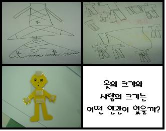 유아들은 친구들이 그린 그림을 보며 사람의 크기에 맞추어 옷을 그려야 한다는 것을 발견했어요.